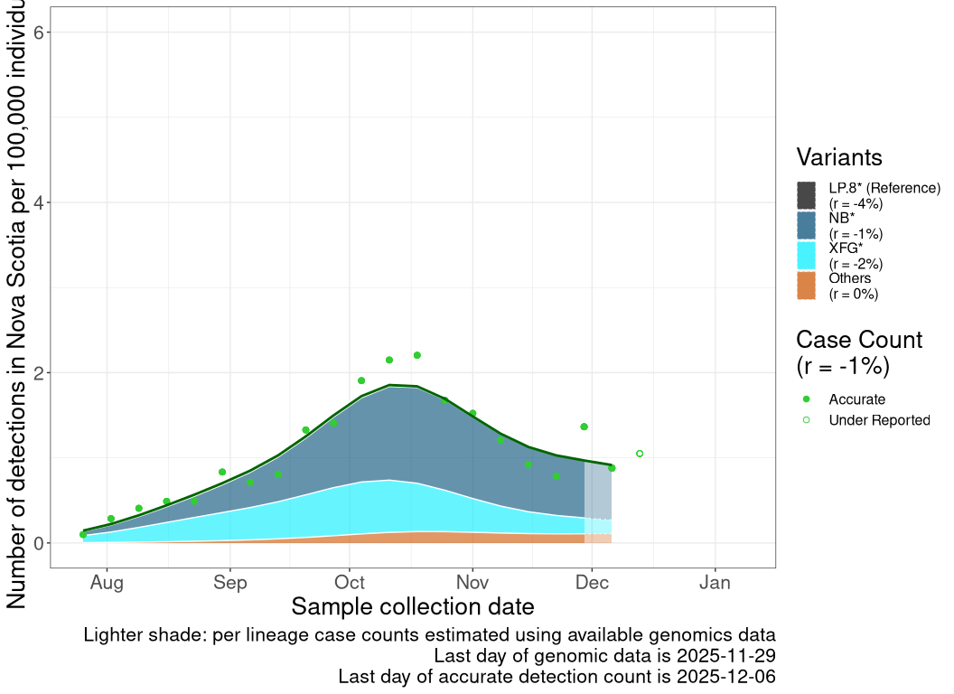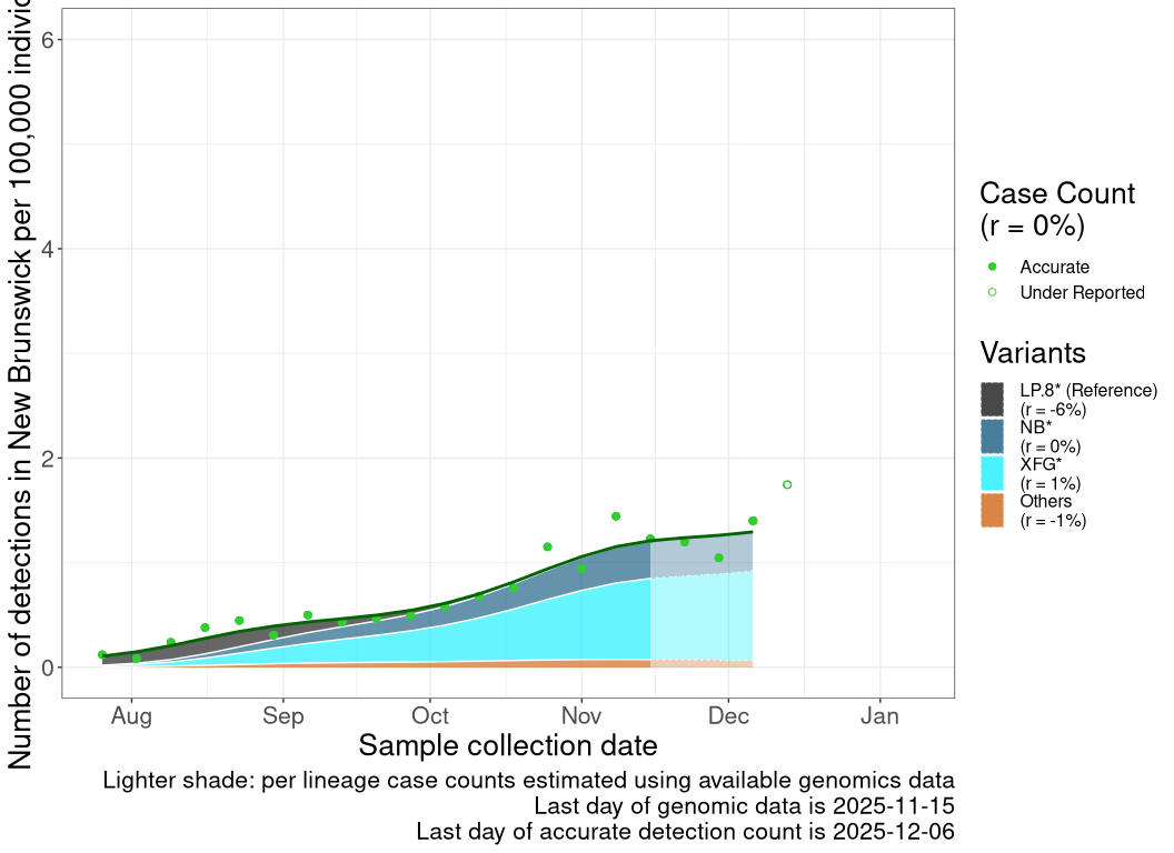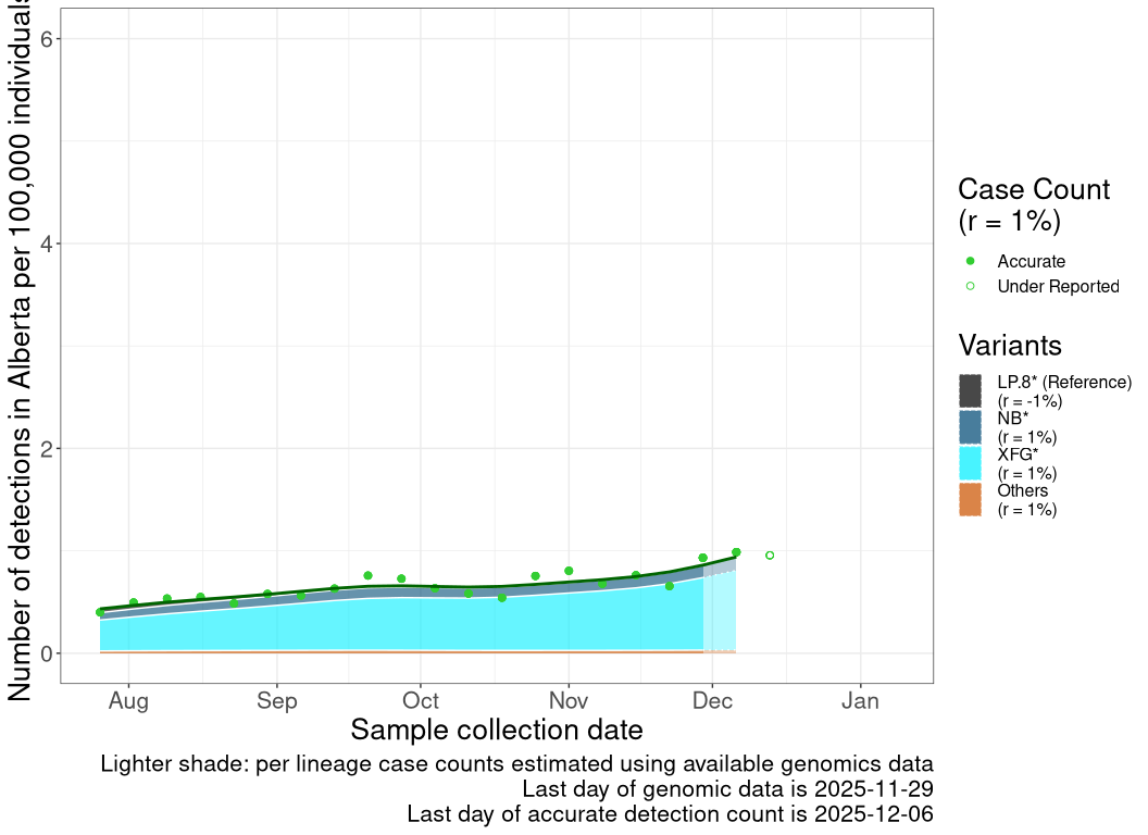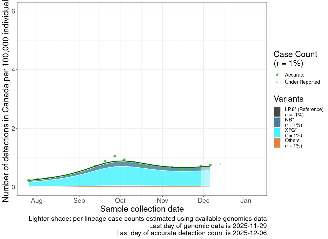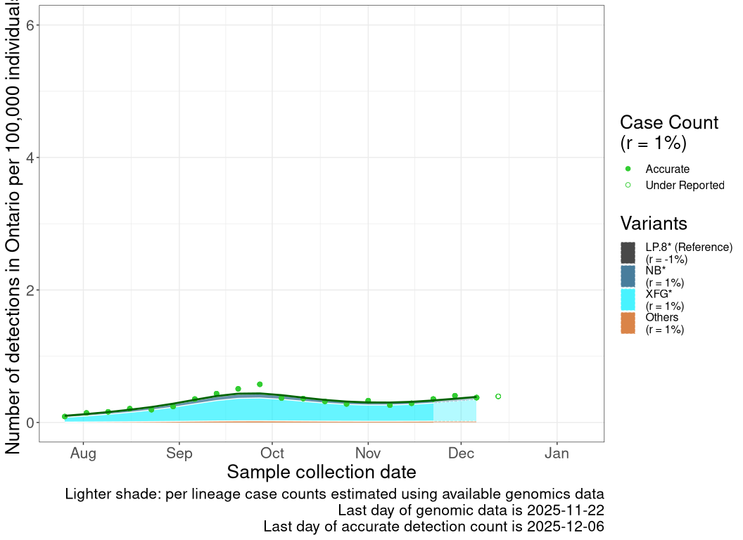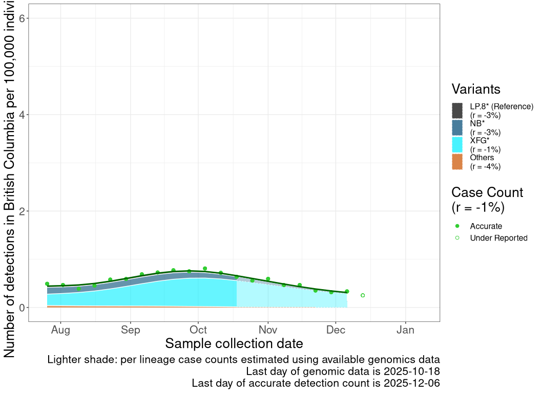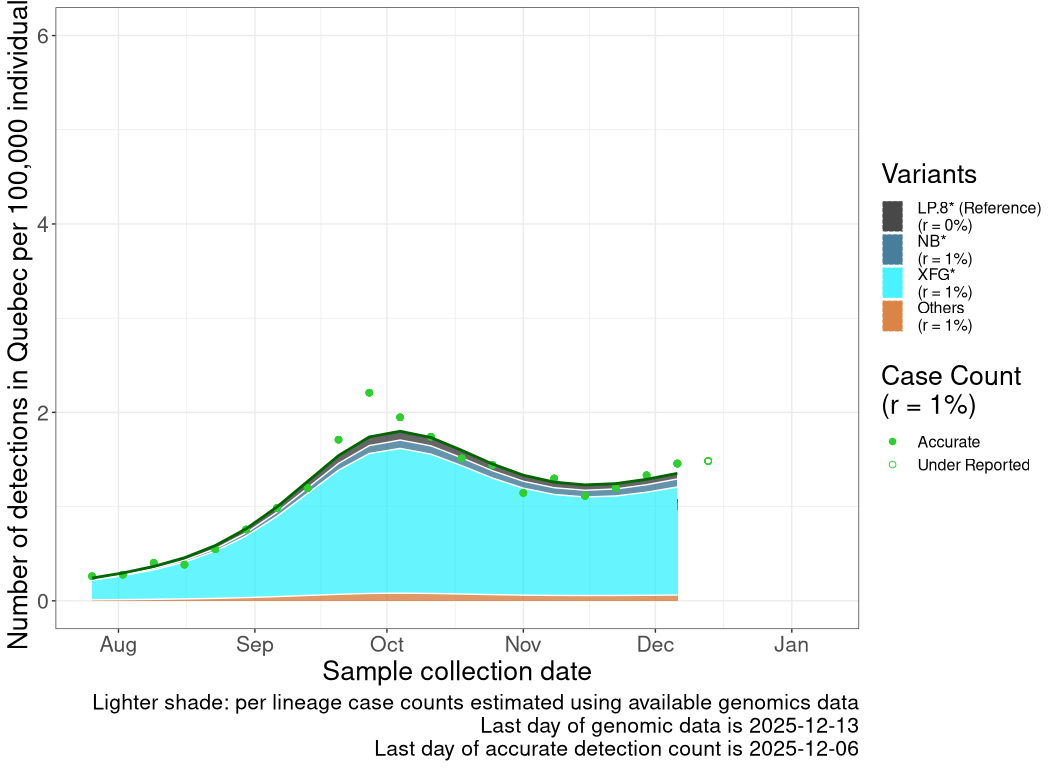 While data on cases and genomic sampling has been limited, the data available to date are consistent with variant XFG driving a wave starting in August that was delayed or extended in some regions into late Fall 2025.