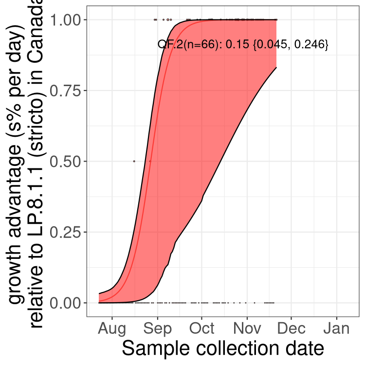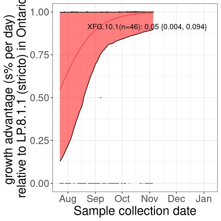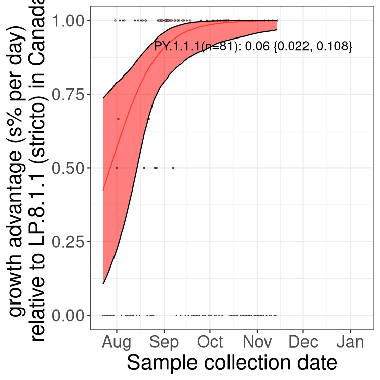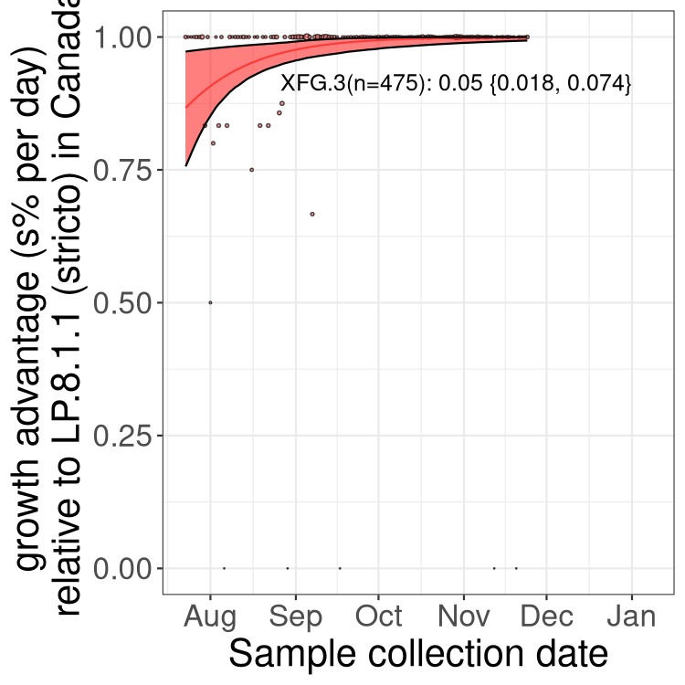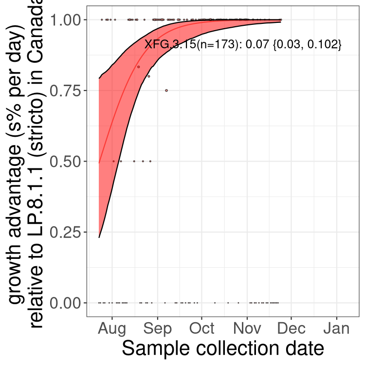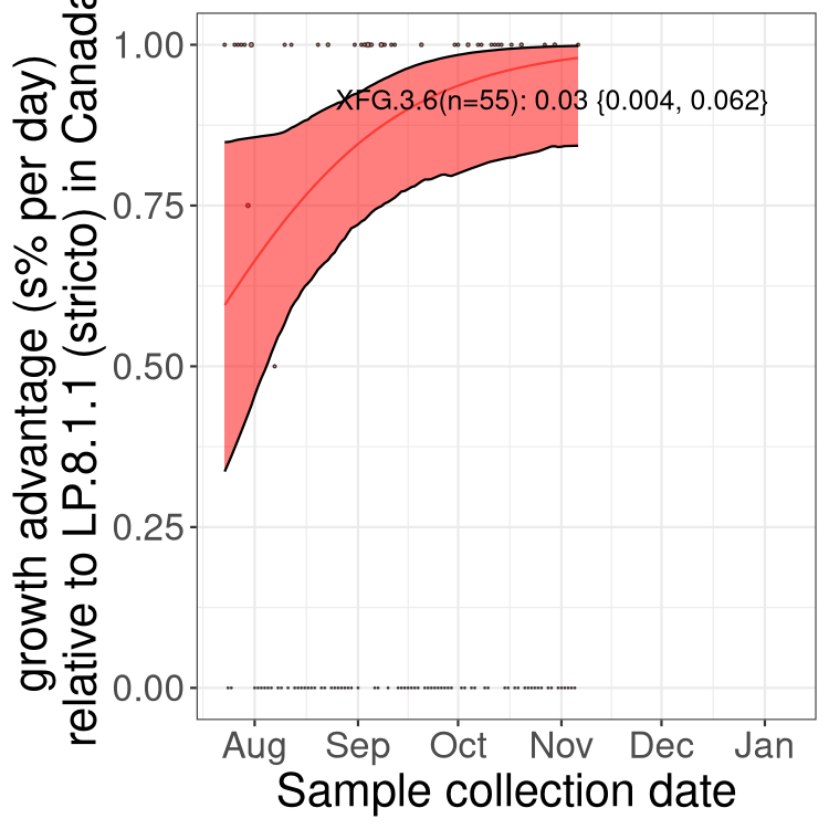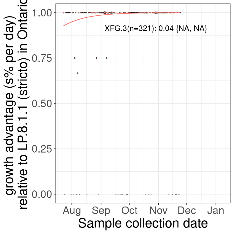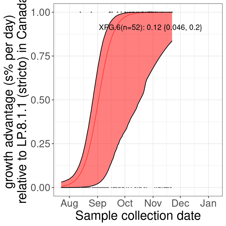 These estimates of selection ignore heterogeneity within provinces and may be biased by the arrival of travel-related cases while frequencies are very low. Sampling strategies that oversample clustered cases (e.g., sequencing outbreaks) will introduce additional variation beyond the multinomial expectation, but these should lead to one-time shifts in frequency rather than trends over time. Provinces with sampling strategies that are variant specific are removed, unless explicit information about the variant frequencies is available.