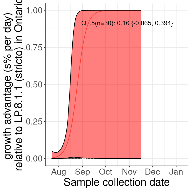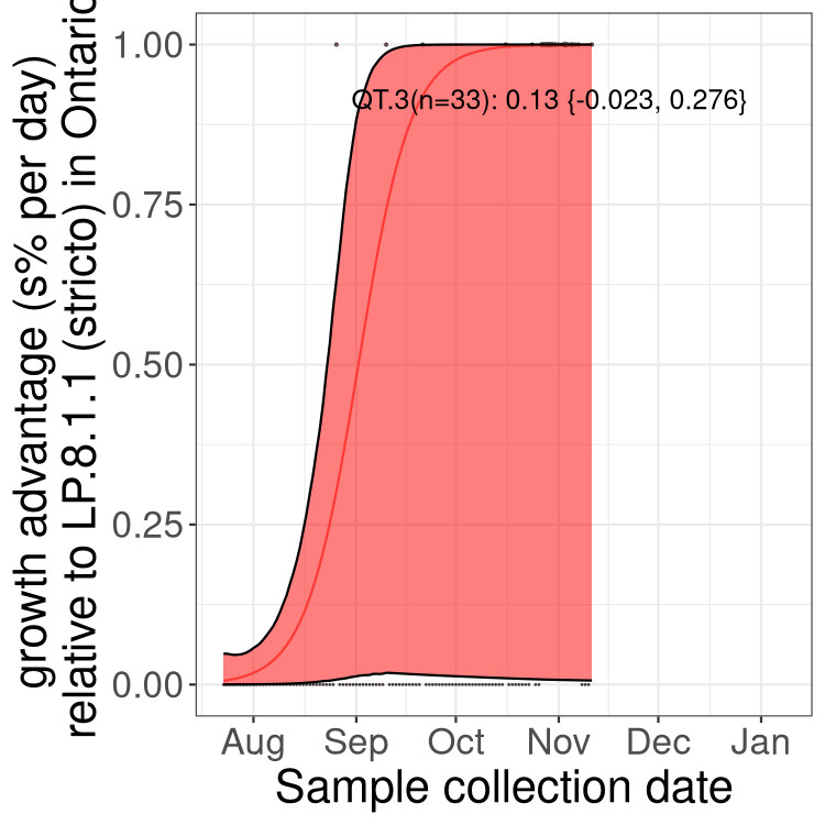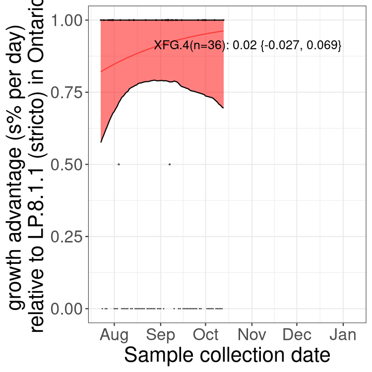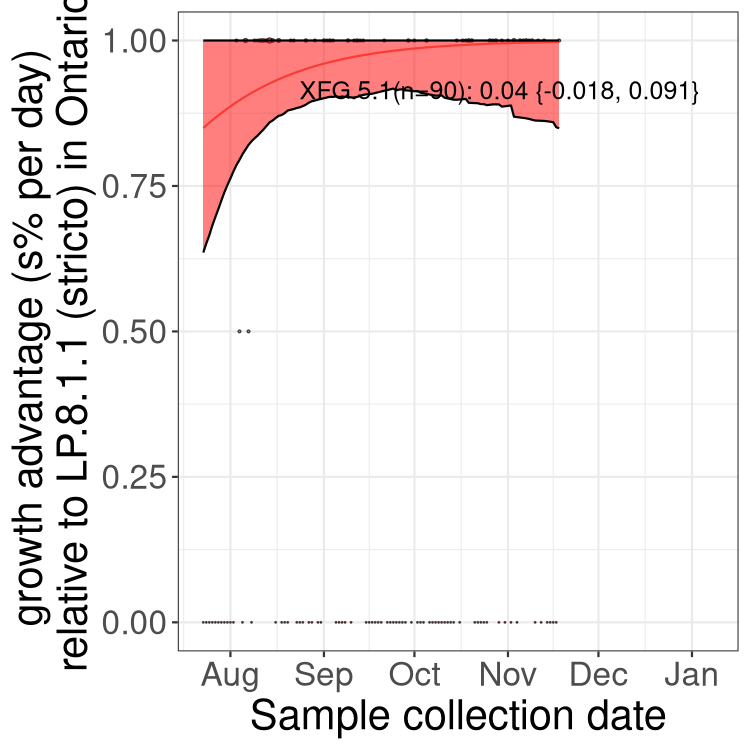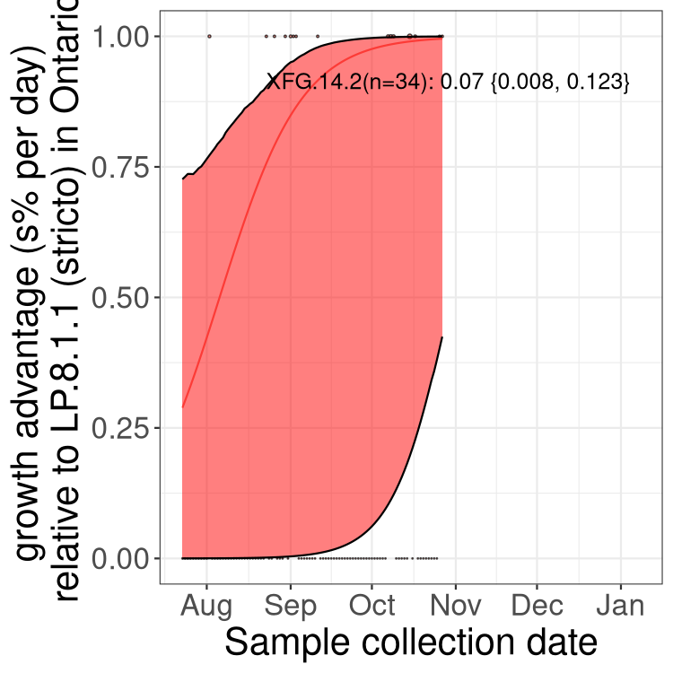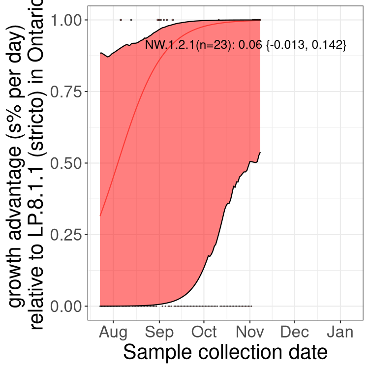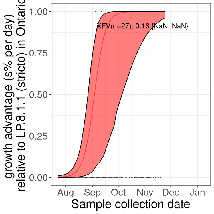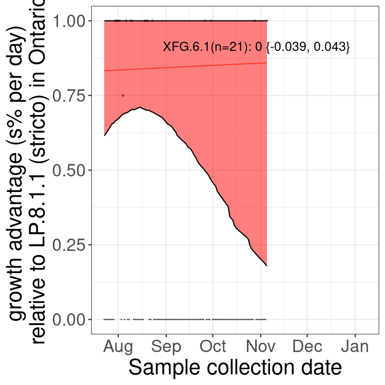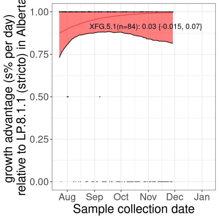 These estimates of selection ignore heterogeneity within provinces and may be biased by the arrival of travel-related cases while frequencies are very low. Sampling strategies that oversample clustered cases (e.g., sequencing outbreaks) will introduce additional variation beyond the multinomial expectation, but these should lead to one-time shifts in frequency rather than trends over time. Provinces with sampling strategies that are variant specific are removed, unless explicit information about the variant frequencies is available.