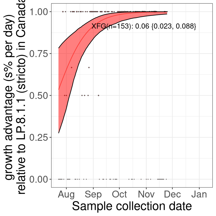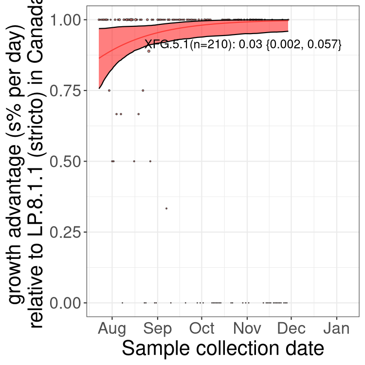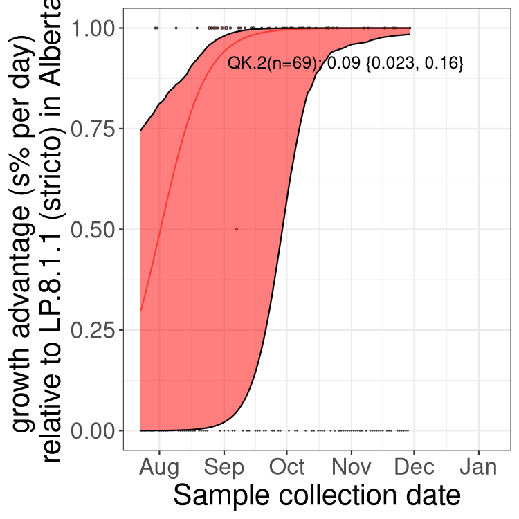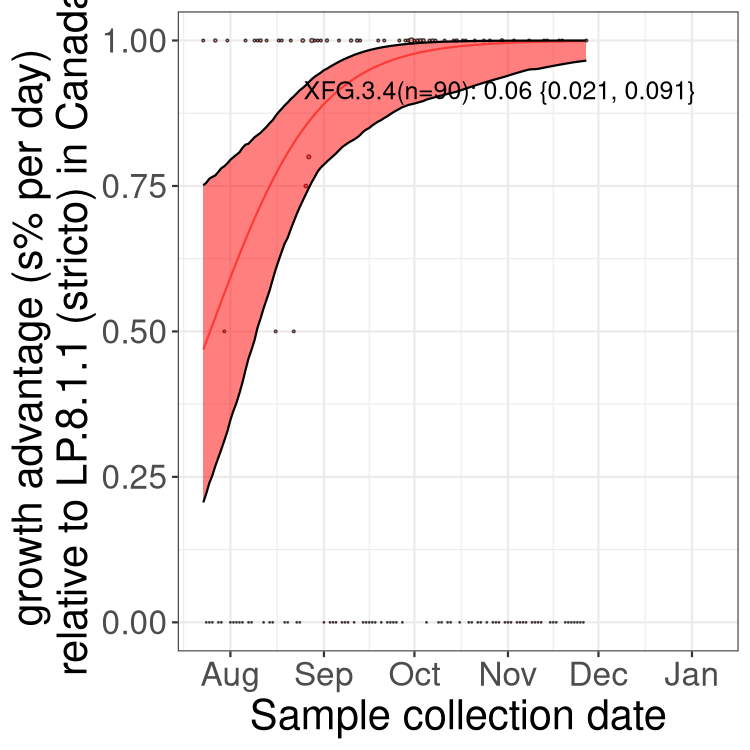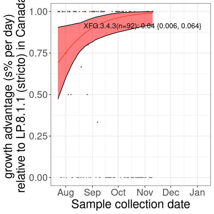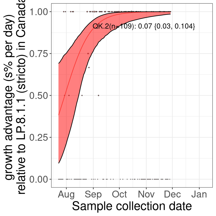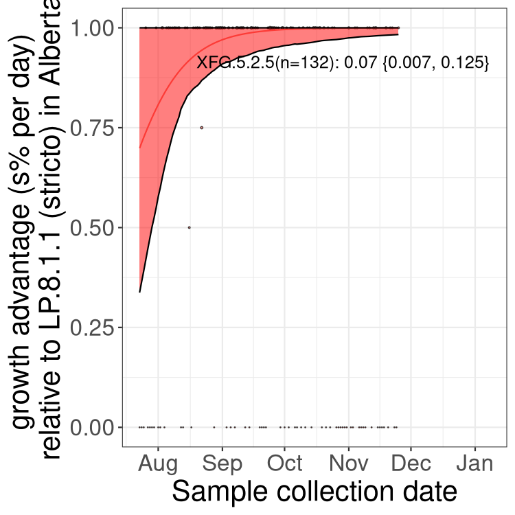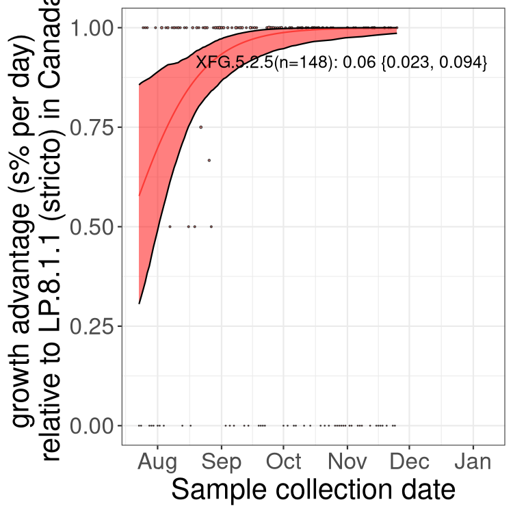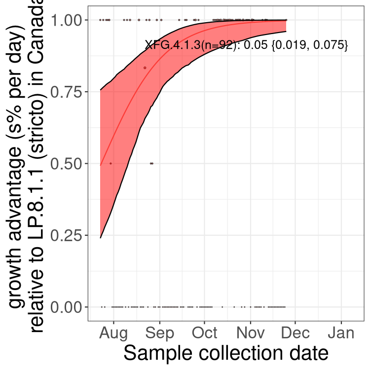 Here we examine the relative rate of spread of the different sublineages of SARS-CoV-2 currently circulating in Canada. Specifically, we determine if a new or emerging lineage has a selective advantage (s), and by how much, against a previously common reference lineage (broad scale (and in the Fastest Growing Lineages section): LP.8* and at the fine scale, against LP.8.1.1; see methods for more details about selection and how it is estimated).