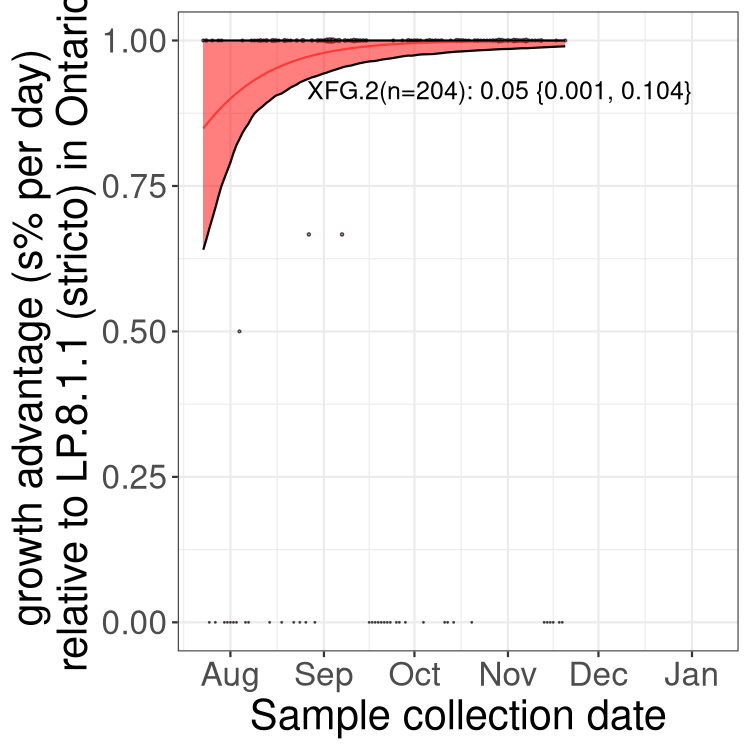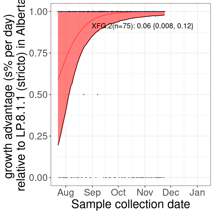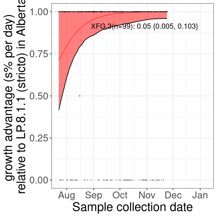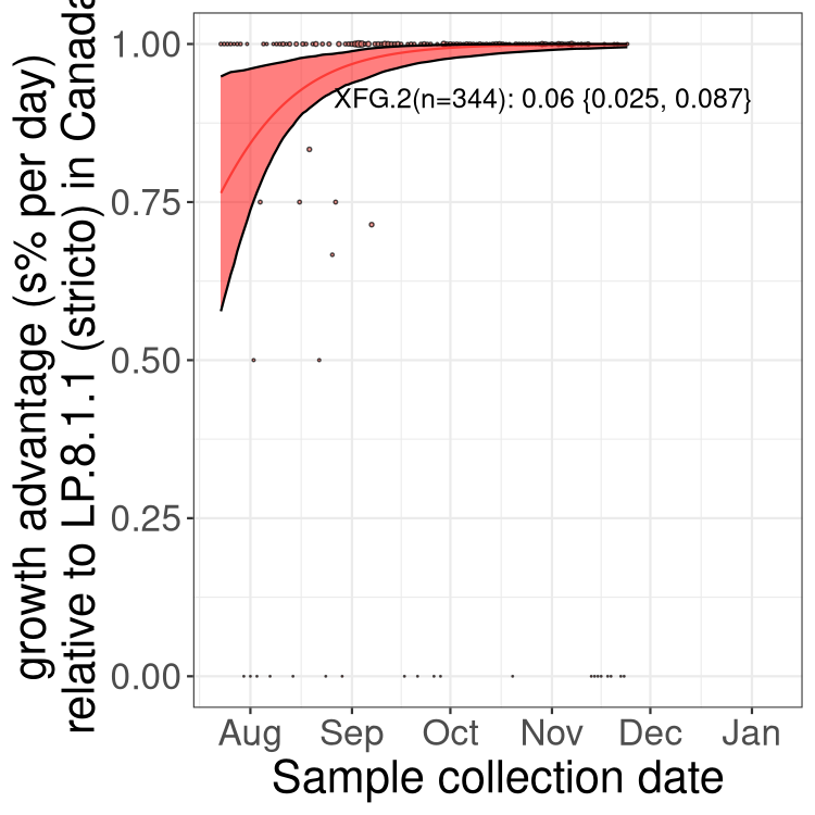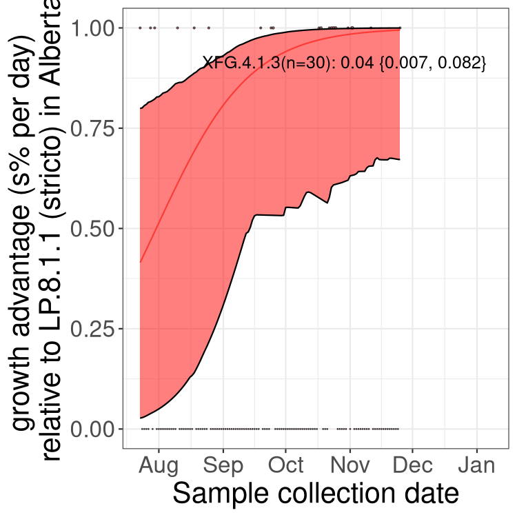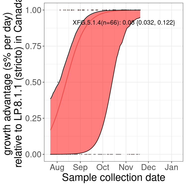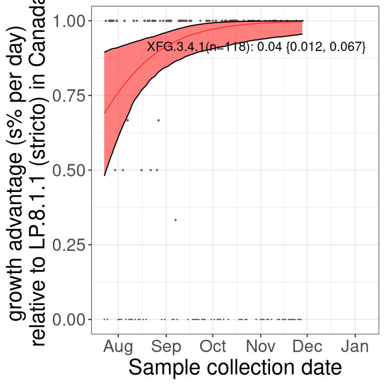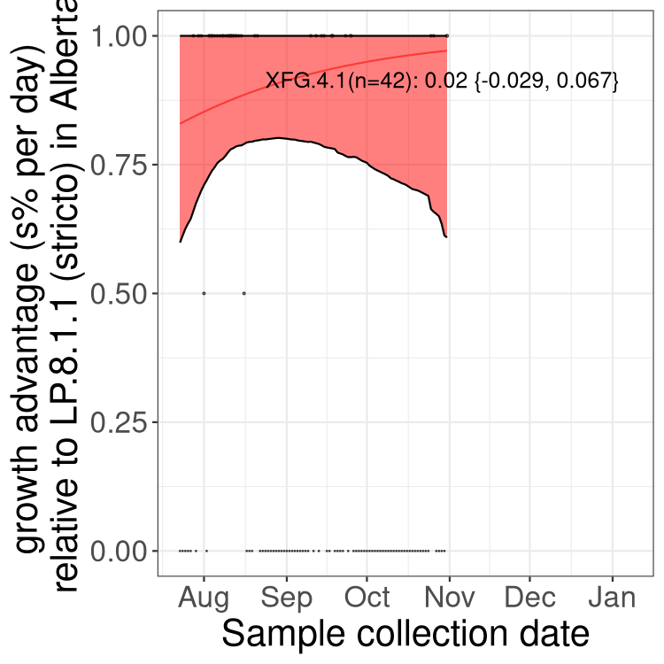 Here we examine the relative rate of spread of the different sublineages of SARS-CoV-2 currently circulating in Canada. Specifically, we determine if a new or emerging lineage has a selective advantage (s), and by how much, against a previously common reference lineage (broad scale (and in the Fastest Growing Lineages section): LP.8* and at the fine scale, against LP.8.1.1; see methods for more details about selection and how it is estimated).