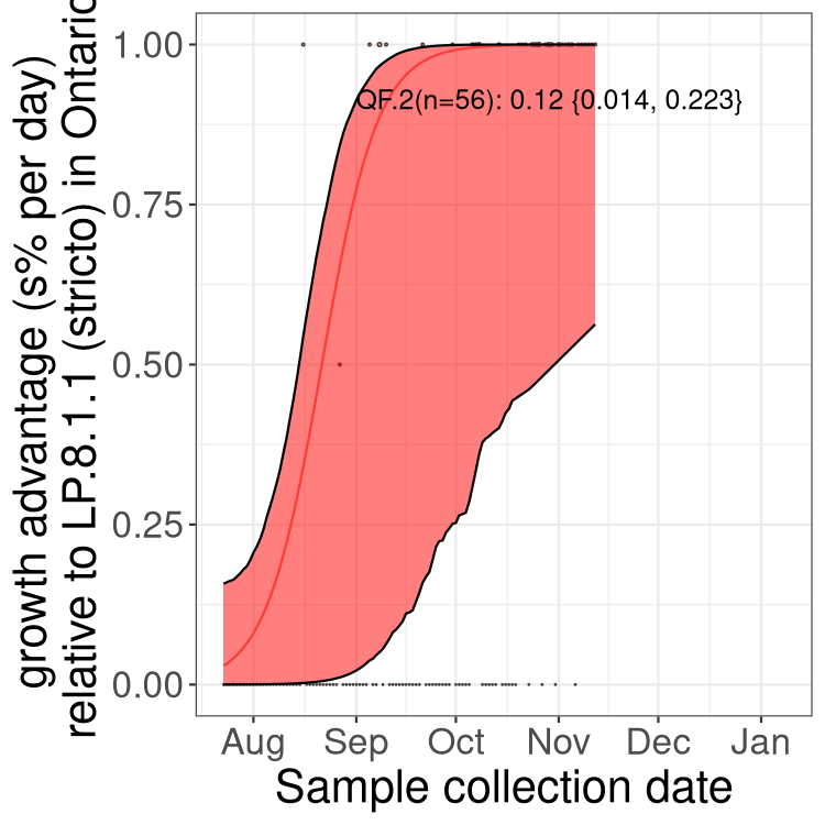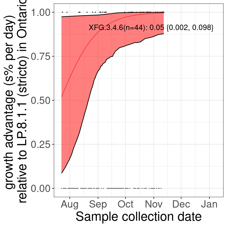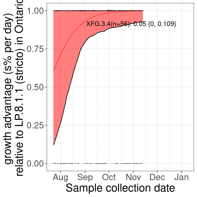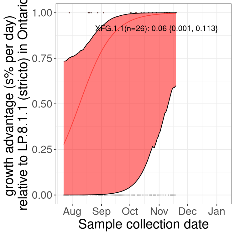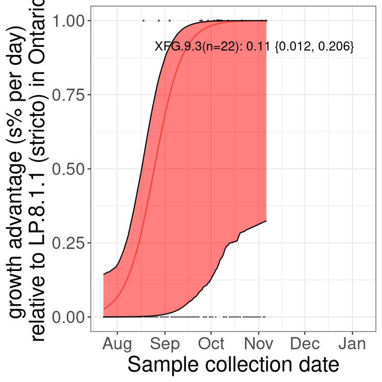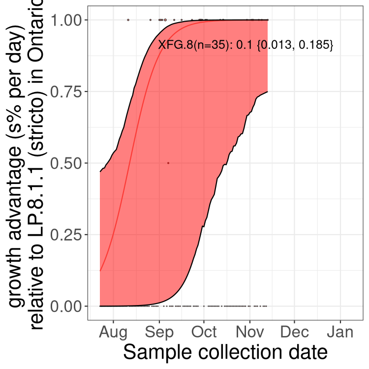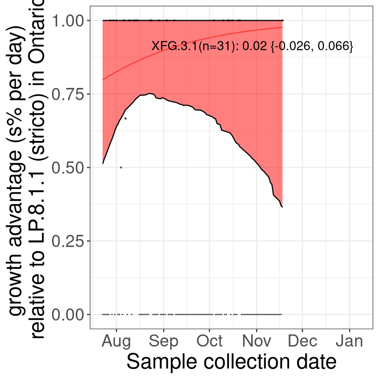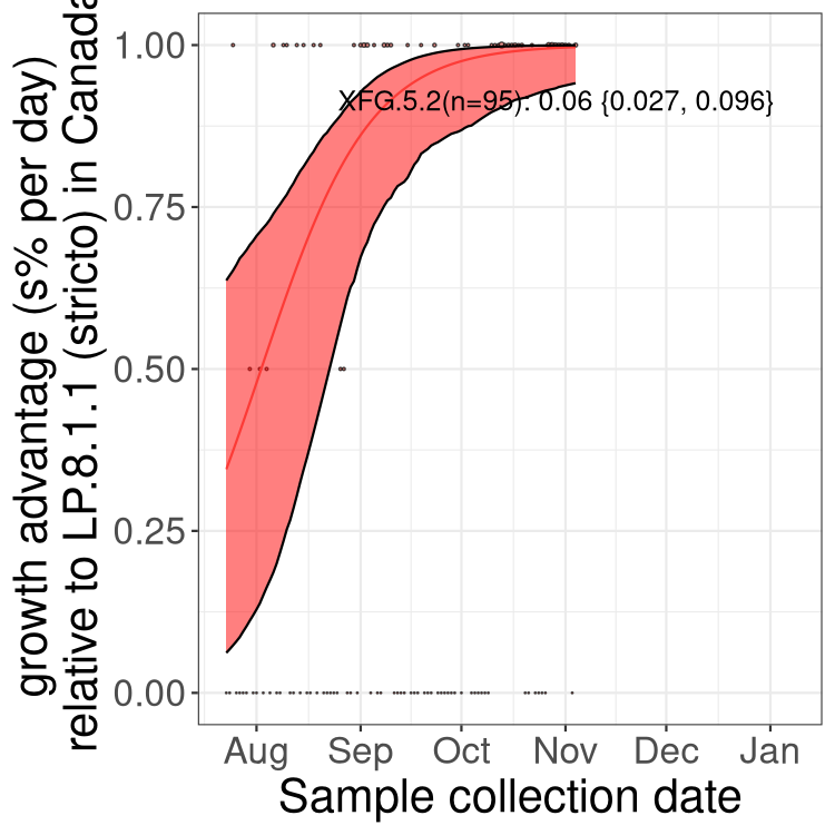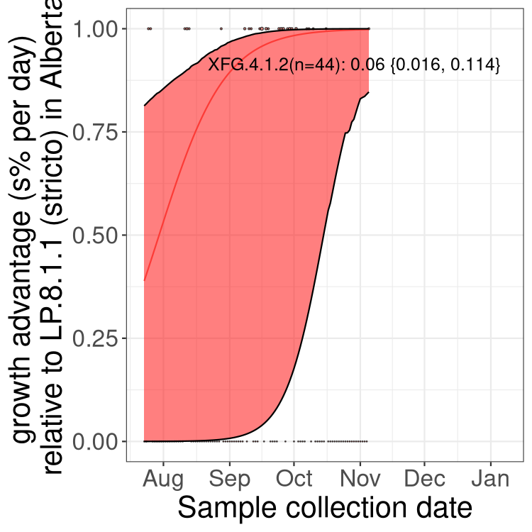 Here we examine the relative rate of spread of the different sublineages of SARS-CoV-2 currently circulating in Canada. Specifically, we determine if a new or emerging lineage has a selective advantage (s), and by how much, against a previously common reference lineage (broad scale (and in the Fastest Growing Lineages section): LP.8* and at the fine scale, against LP.8.1.1; see methods for more details about selection and how it is estimated).