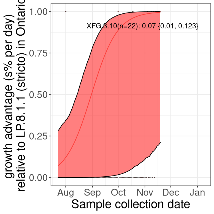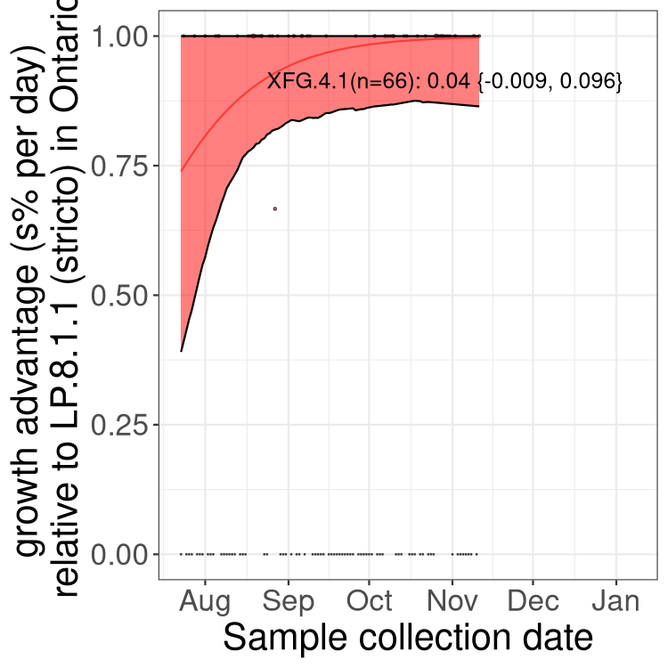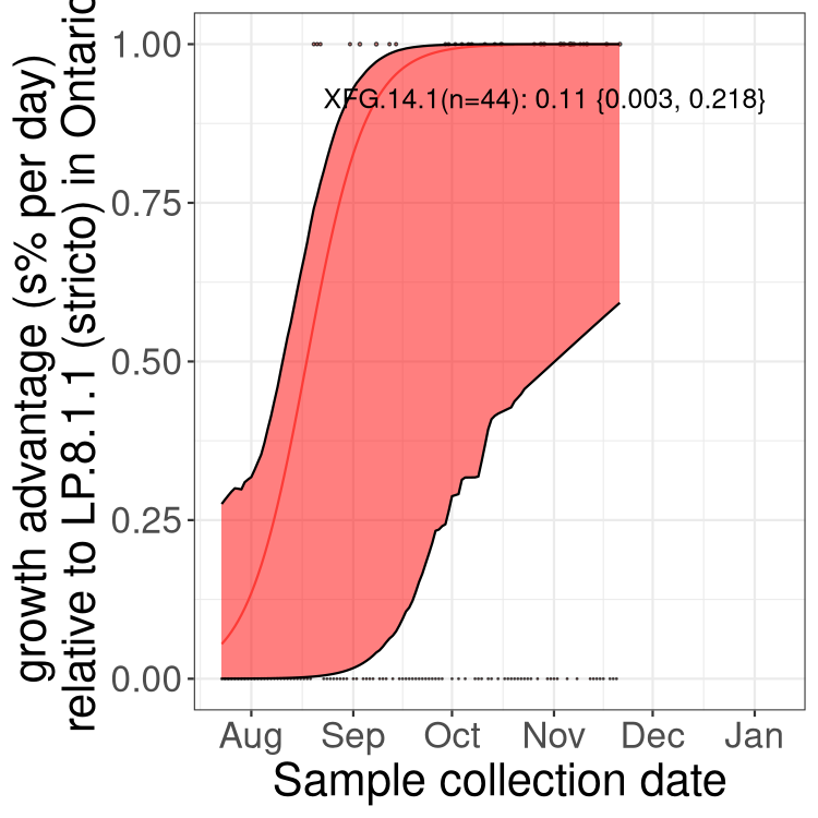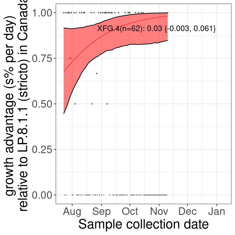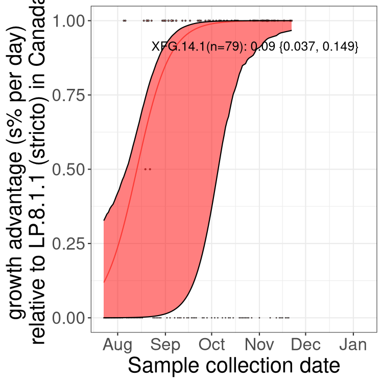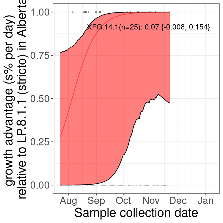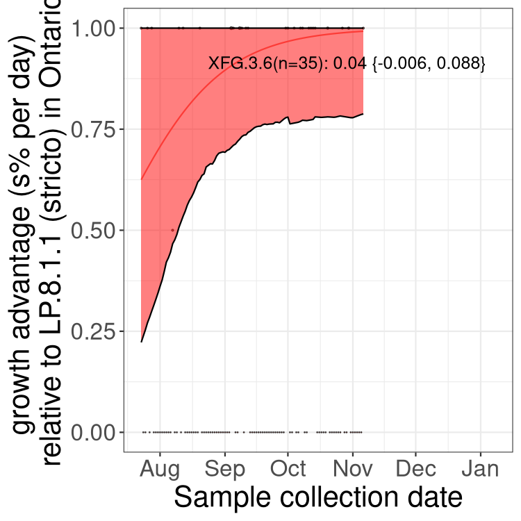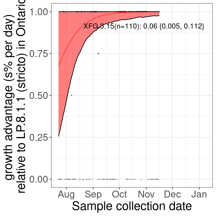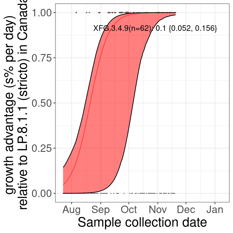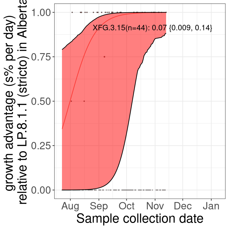 Caveat: These selection analyses must be interpreted with caution due to the potential for non-representative sampling, lags in reporting, and spatial heterogeneity in prevalence of different sublineages across Canada. Provinces that do not have at least 20 sequences of a lineage during this time frame are not displayed.