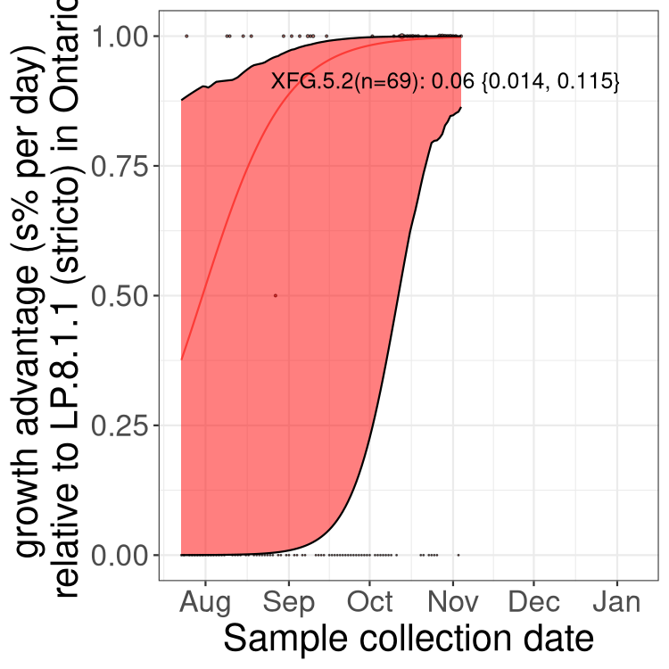 Graphs illustrating the rise in frequency of a variant over time are shown (left panels), with the area of each dot proportional to the number of sequences. 95% confidence bands were obtained by randomly drawing 10,000 sets of parameters (\(p_i\) and \(s_i\) for each sub-type) using RandomFromHessianOrMCMC, assuming a multi-normal distribution around the maximum likelihood point (estimated from the Hessian matrix, Pawitan 2001). At each point in time, the 2.5%-97.5% range of values for \(p_i(t)\) are then shown in the confidence bands.