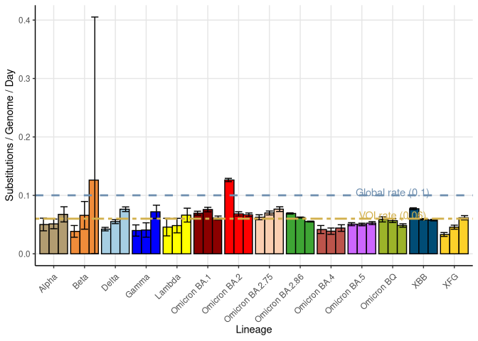 Substitution rates were obtained from the maximum likelihood tree made using IQ-TREE and a root-to-tip regression conducted, without forcing the intercept to zero (similar results were seen when forcing the intercept). Up to 10000 samples for non-XBB lineages and all samples for XBB lineages are used to construct this tree. For the estimation of each VOI’s substitution rates over time, all sequences of that VOI present in the tree are used. While this ignores pseudo-replication among the samples due to relatedness, the estimated slope is robust given the large sample sizes. Furthermore, we calculated SE bars from three different independent samples to reduce the influence of closely related viral samples. The global rate estimate was obtained by a regression over time of all the sequences present in the tree, as illustrated in the root-to-tip plot, ignoring variants classification.
